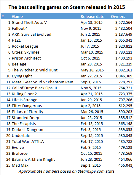 Stats of the top 25 best selling games on Steam in 2015, according to SteamSpy. UNDERTALE is number 20 on the list.